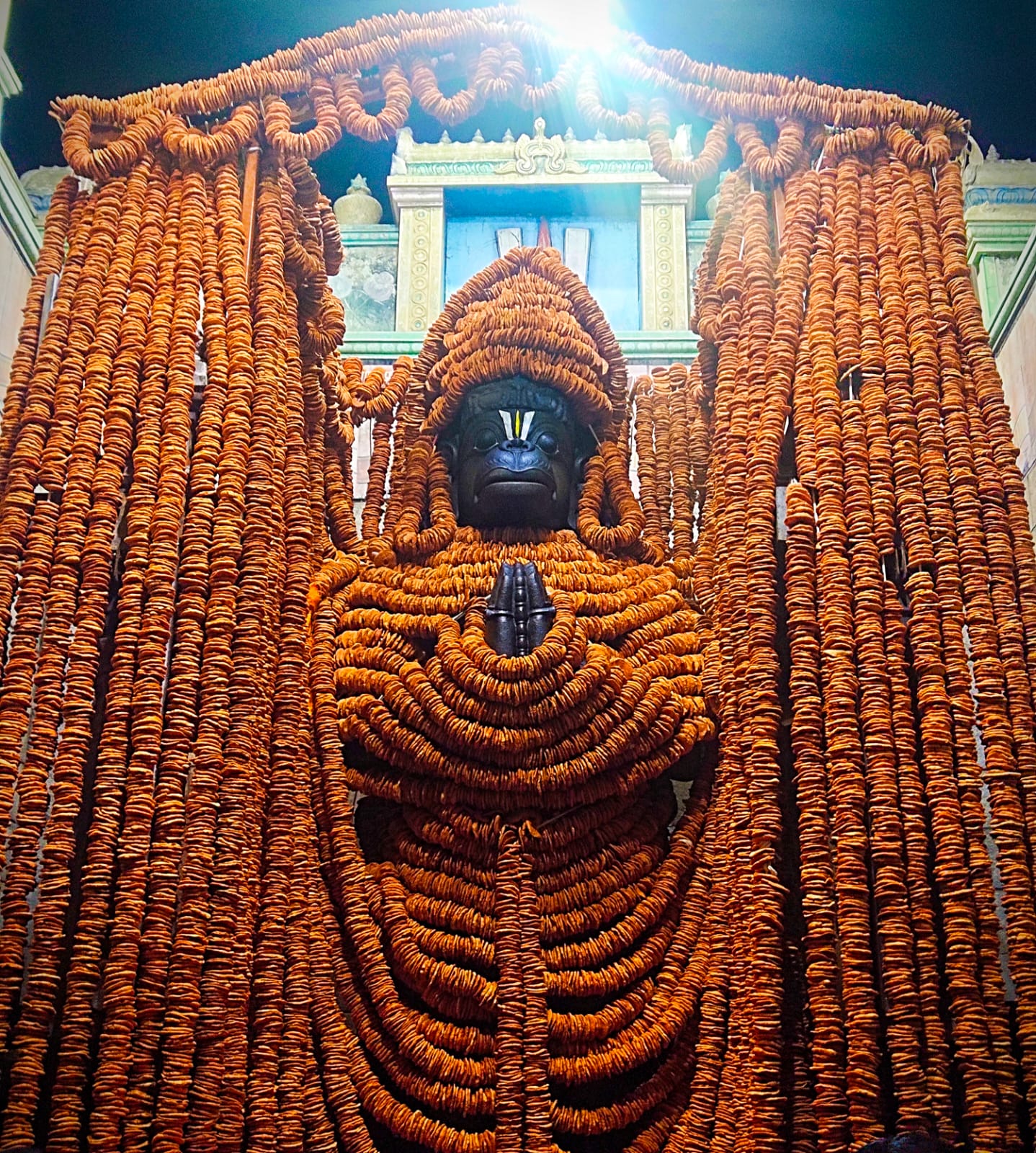 மார்கழி மாதம் மூலம் நட்சத்திரத்தில் அமாவாசையன்று அனுமன் அவதரித்தார். இந்த நாளை அனுமன் ஜெயந்தியாக கொண்டாடுகிறோம் .அனுமன் ஜெயந்தி விழாவான இன்று நகரில் மையப்பகுதியில் வீற்றிருக்கும் 18 அடி உயர விஸ்வரூப ஆஞ்சநேயர் சுவாமிக்கு இன்று அதிகாலை 5 மணிக்கு 1,00,008 வடை மாலை சாற்றப்பட்டது. இந்த வடை மாலை அலங்காரத்தில் பக்தர்களுக்கு காட்சியளித்தார்.